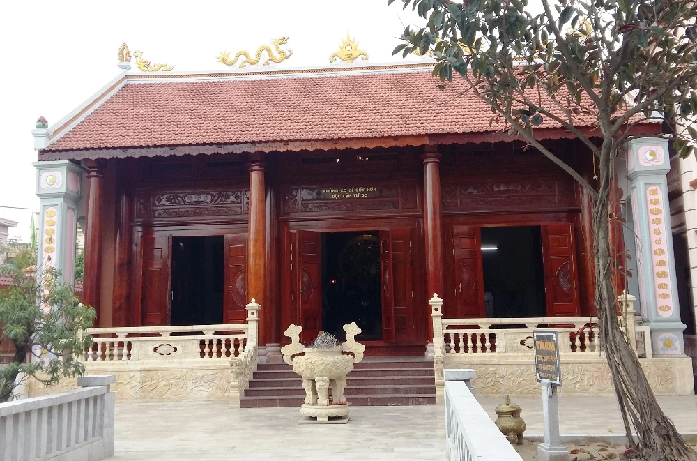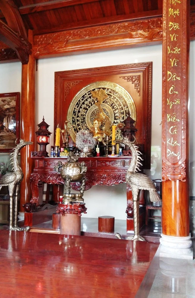 Trên nóc nhà truyền thống có đắp nổi hình tượng rồng phượng; bố trí lư lương bên ngoài trời.