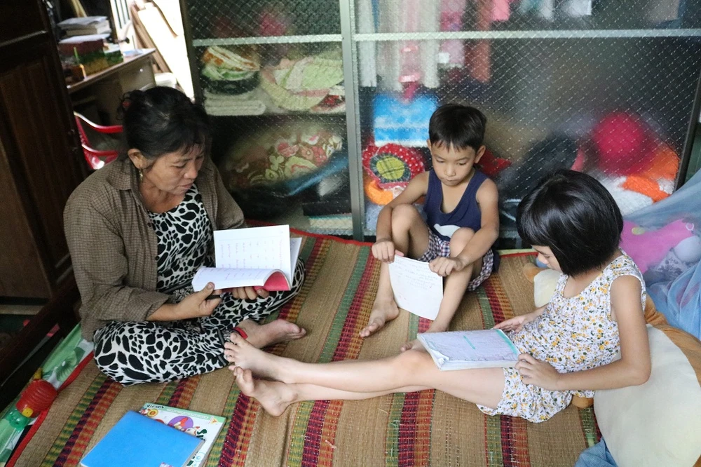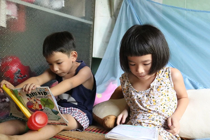 Phước Hùng và Anh Thư tự học bài ở nhà chứ không đến trường học thêm như các bạn cùng tuổi. Ảnh: THANH TUYỀN.