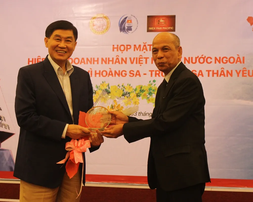 Ông Peter Hồng, Phó Chủ tịch Thường trực kiêm Tổng Thư ký Hiệp hội Doanh nhân Việt Nam ở nước ngoài, trao hoa cảm ơn cho ông Jonathan Hạnh Nguyễn, một doanh nhân kiều bào có nhiều đóng góp tích cực cho biển đảo thân yêu. Ảnh: H.LAN