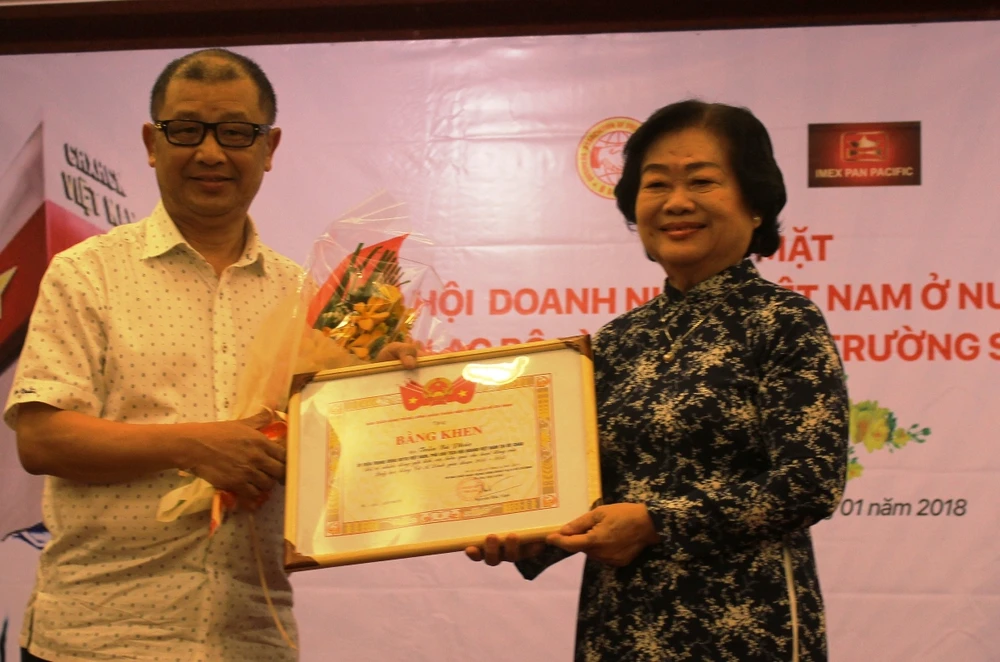 Bà Trương Mỹ Hoa trao bằng khen Trung ương Đoàn TNCS Hồ Chí Minh cho luật sư Trần Bá Phúc - Chủ tịch Hội Doanh nhân Việt Nam tại Úc. Ảnh: H.LAN