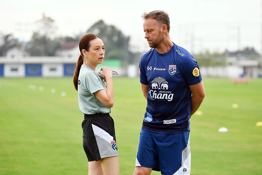 Trưởng đoàn bóng đá Thái Lan Nualphan và HLV Polking. Ảnh: BKP