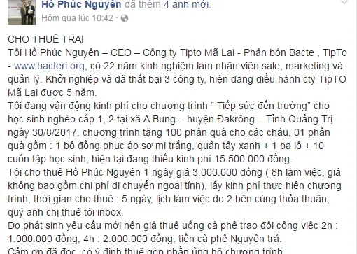Chia sẻ về nguyên do đăng status “Cho thuê trai” của mình, anh Nguyên hài hước: “Tại bí quá không biết phải làm sao cả. Số tiền đó tôi bỏ ra cũng được thôi, nhưng tôi muốn là cả cộng đồng cùng chung tay góp sức. Đang không biết phải làm như thế nào thì có công ty du lịch thuê tôi dạy hai ngày. Tôi bảo dạy không lấy tiền nhưng có thể ủng hộ vào chương trình của tôi 5 triệu đồng được không. Họ đồng ý và từ đó tôi nảy ra ý tưởng cho thuê mình như ở trên”.