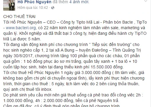 Tôi cho thuê Hồ Phúc Nguyên (chính tôi), với giá 3 triệu đồng/ngày (với 8 giờ làm việc, giá không bao gồm chi phí di chuyển ngoại tỉnh), lấy kinh phí thực hiện chương trình.
