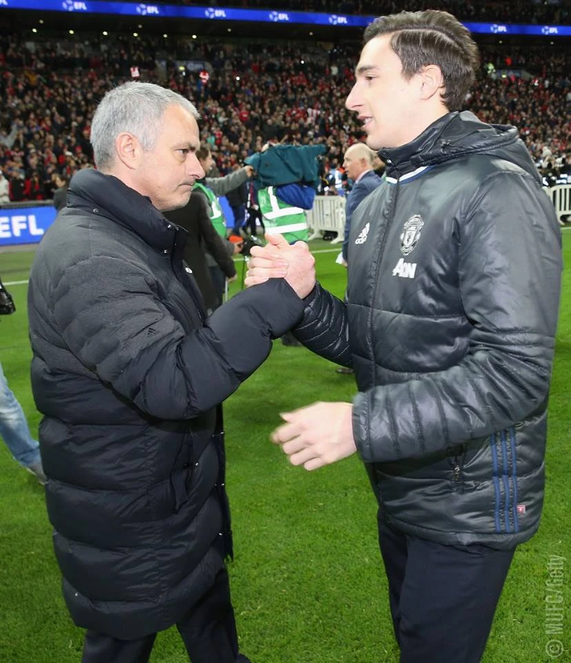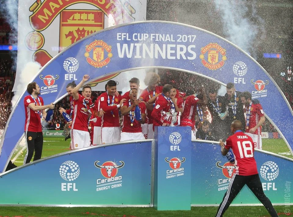 Trên sân, các cầu thủ MU phấn khích với chiếc cúp chính thức đầu tiên dưới thời Mourinho (không tính siêu cúp Anh)