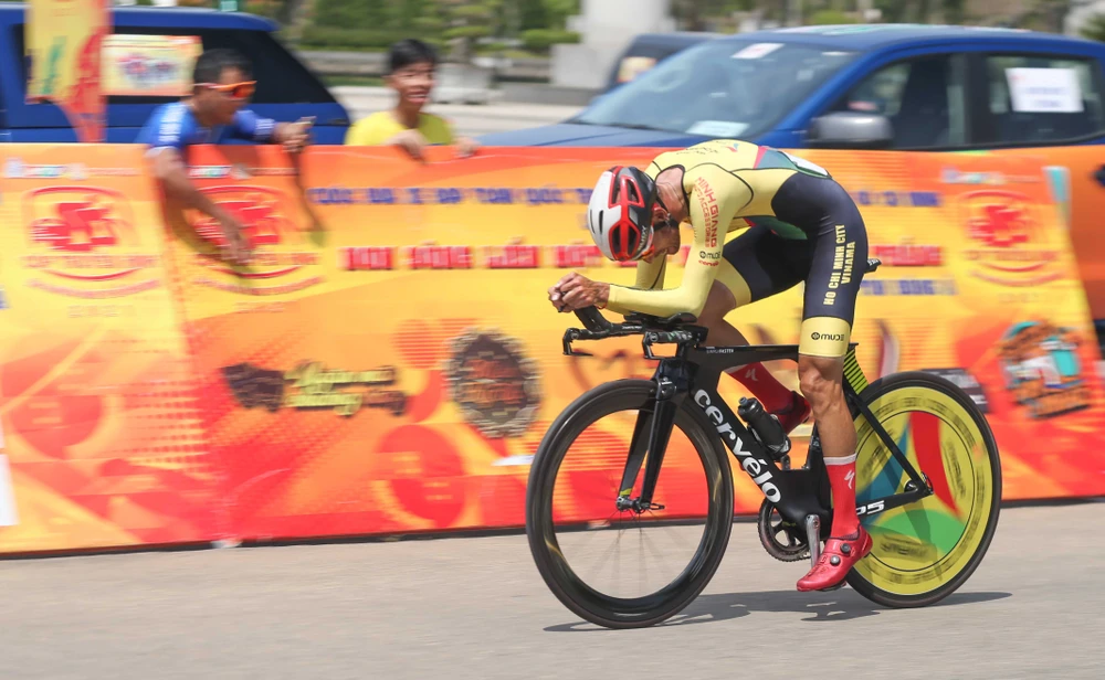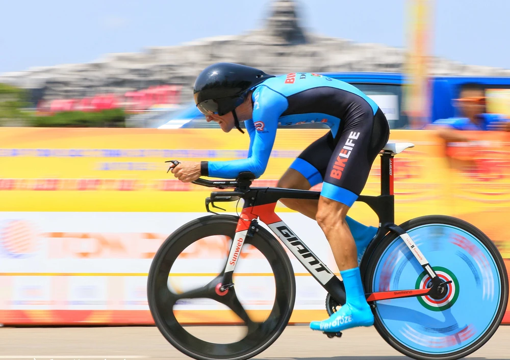 Tay đua Loic Desriac duy trì ngôi "vương" nội dung đua cá nhân tính giờ trước Tượng đài mẹ Thứ. ẢNH: ANH THUẬN