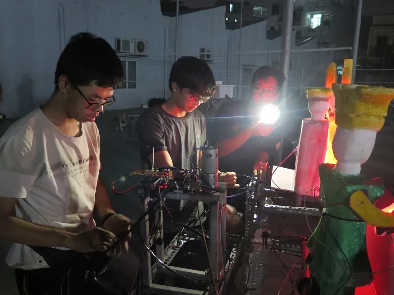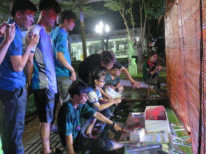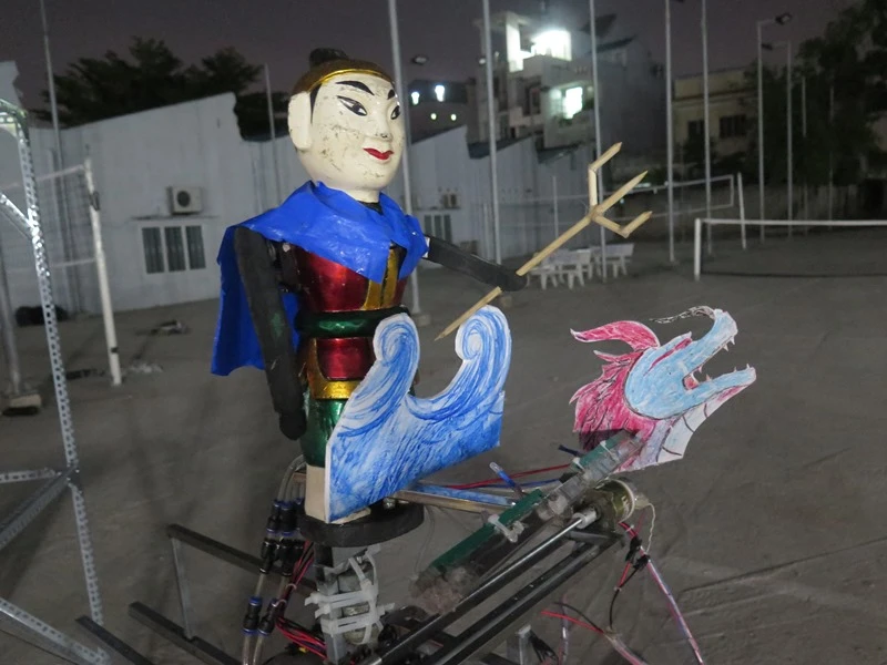 Đặc biệt, vẫn là những con rối nước truyền thống nhưng phía sau tấm rèm không có một nghệ nhân nào phải trầm mình dưới nước. Thay vào đó là các em đang chăm chú lập trình, điều khiển từ xa.