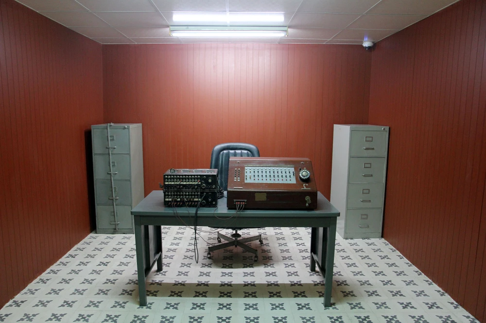 Các phòng trong hầm liên kết với nhau bằng những lối đi nhỏ được đúc bằng bê tông, trong ảnh là phòng mật mã.