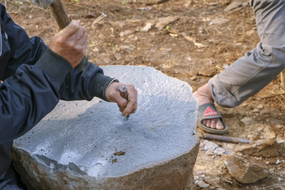 Nghề chẻ đá mồ côi được người dân ở đây làm từ hàng chục năm qua. Trước đây, người dân chẻ những tảng đá to thành các dụng cụ lao động như cối xay lúa, xay đậu... Về sau đá chẻ còn dùng trong xây móng nhà, lăng mộ... Ảnh: B.TRÂM