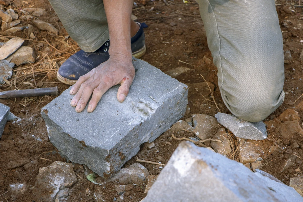 Mỗi đội có hai người, họ phải chẻ từ viên đá to bốn, năm người khiêng thành những viên đá nhỏ vuông thành sắc cạnh với kích thước 10x18x26 cm. Ảnh: B.TRÂM
