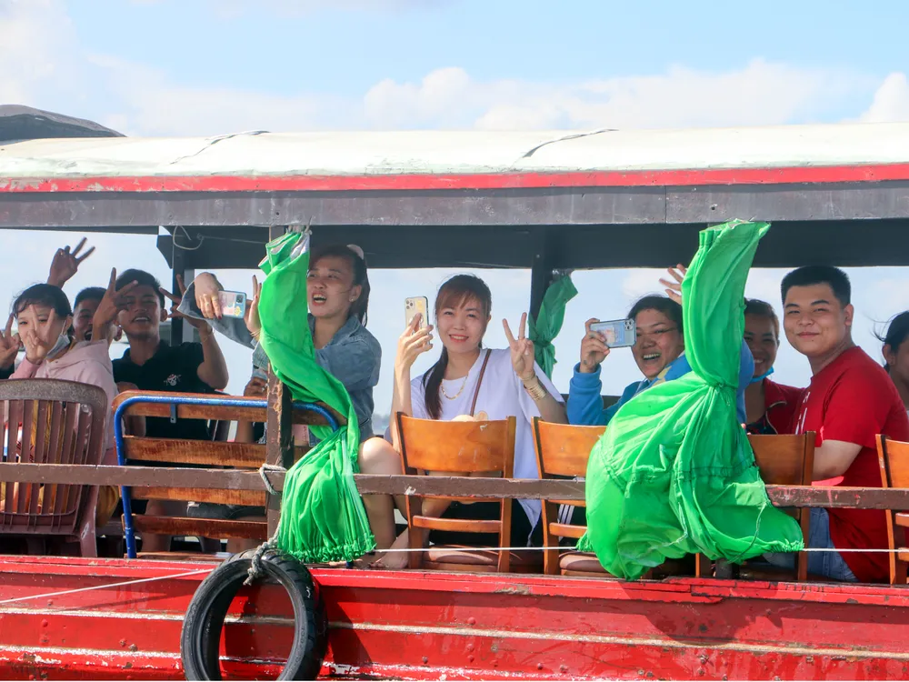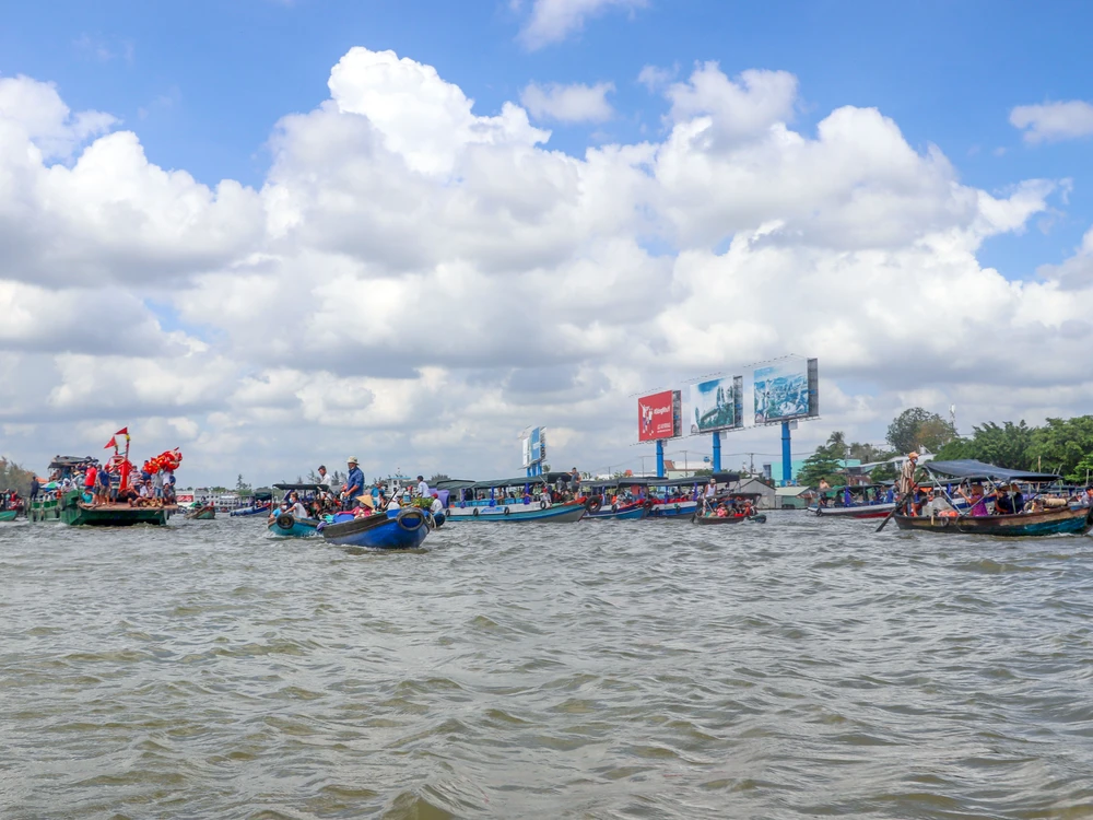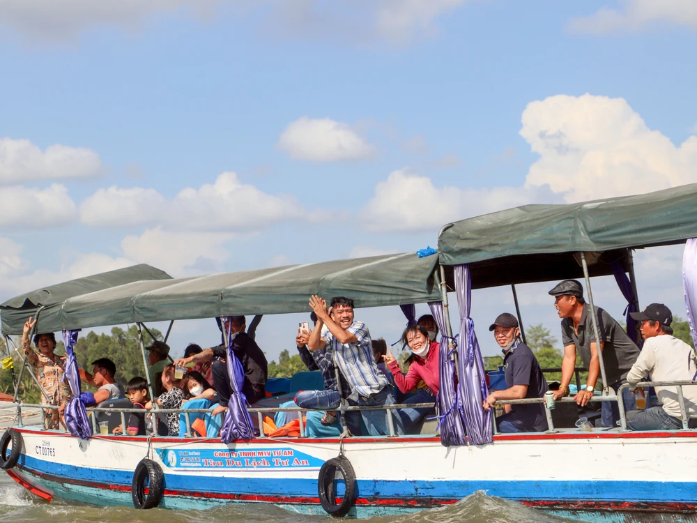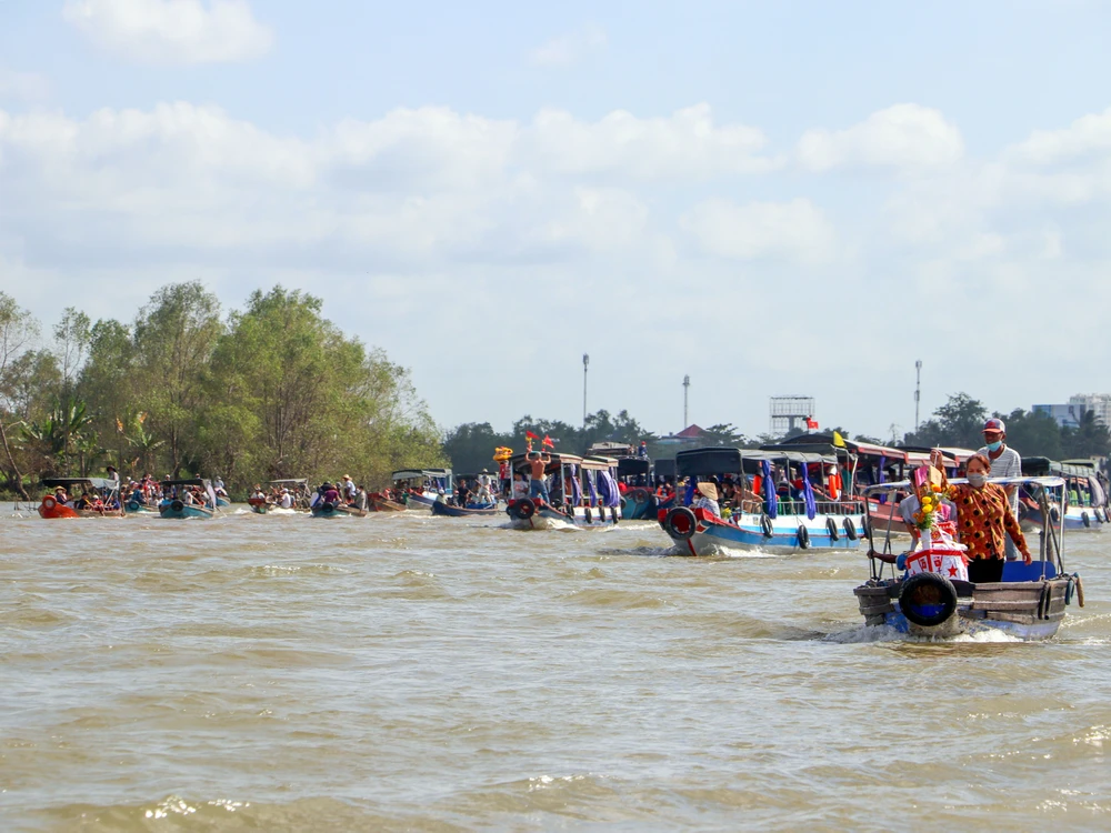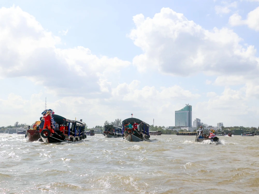 Trong lúc diễu hành, nhiều người nhảy múa, reo hò cộng với âm thanh múa lân của tàu dẫn đoàn tạo nên không khí sôi động trên cả một khúc sông.