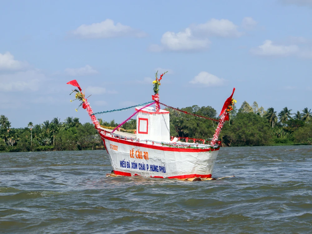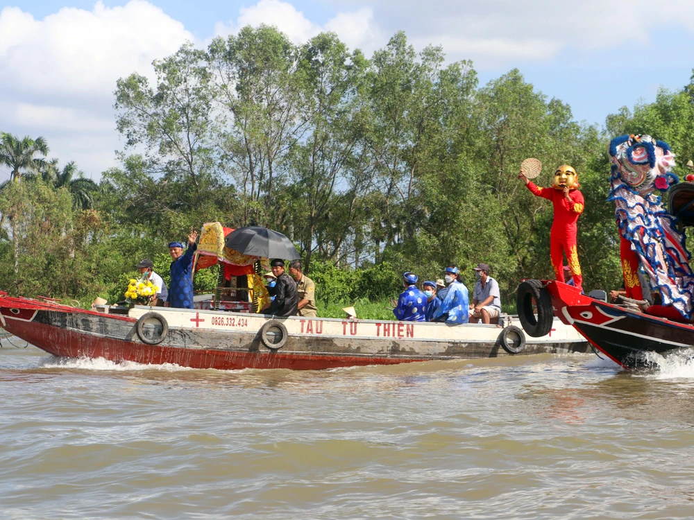 Sau hơn một giờ diễu hành, đoàn tàu di chuyển đến giữa sông Hậu và tiến hành nghi thức hạ thủy “tàu tống ôn”.