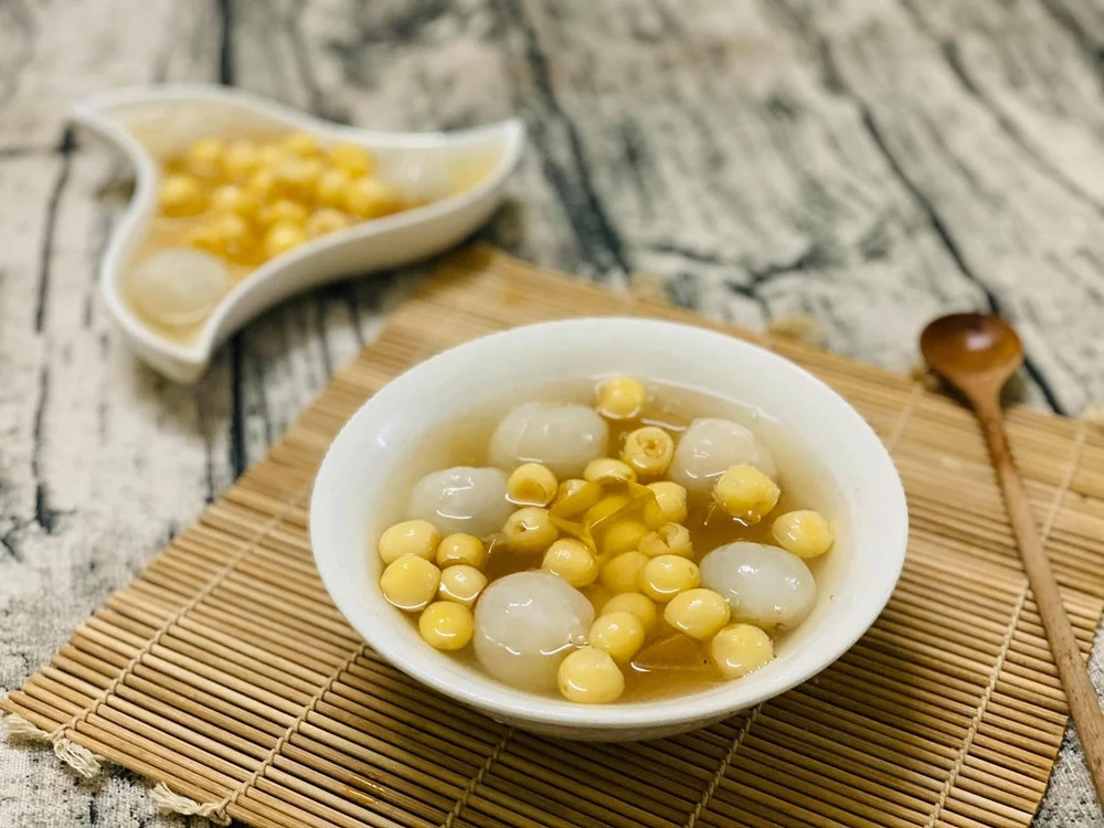 Chị Oanh còn làm thử món chè sen Huế cùng với vải. Ảnh: NVCC