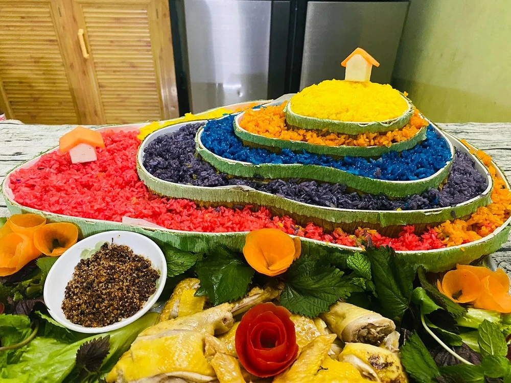 Chị Oanh mất hơn 1 tiếng để làm xong mâm xôi, không tính thời gian làm khuôn, ngâm gạo và gà đã được làm sạch trước đó. Chị làm song song hai món đồ xôi và hấp gà nên tiết kiệm được thời gian. Tranh thủ lúc hấp xôi và gà, chị chuẩn bị đồ trang trí như tỉa hoa, ngôi nhà. Hoa được làm từ quả mận Hà Nội, nhà được làm từ cà rốt và củ cải. Khi trang trí, chị Oanh đã hình dung ra khung cảnh của từng địa điểm tại Tây Bắc rồi đặt từng chi tiết vào mâm xôi.