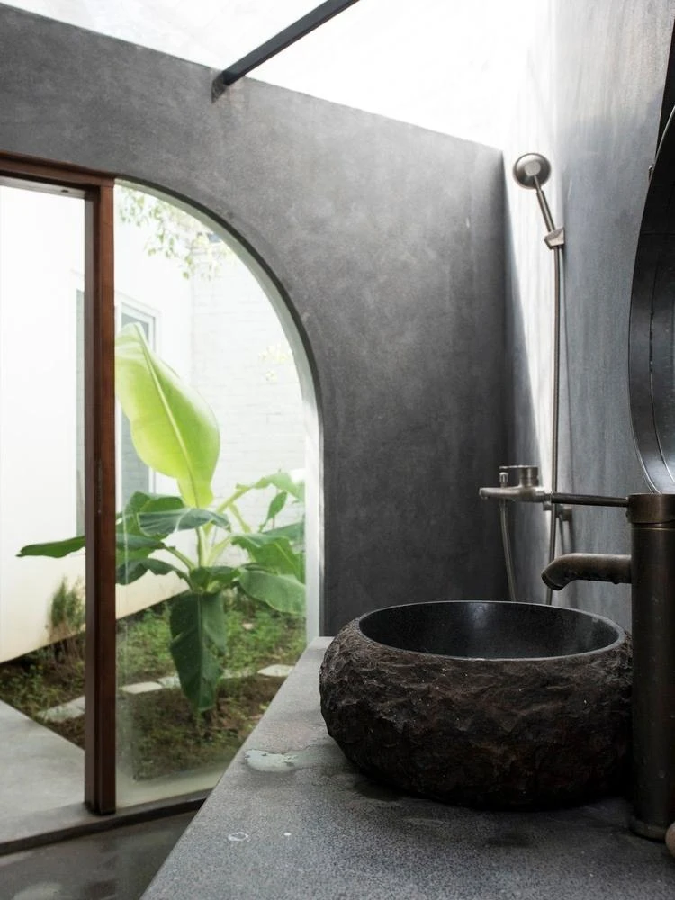 Thông qua cánh cửa gỗ, không gian riêng tư sẽ được mở toang ra khoảng sân trong xanh mát, thông thoáng. |