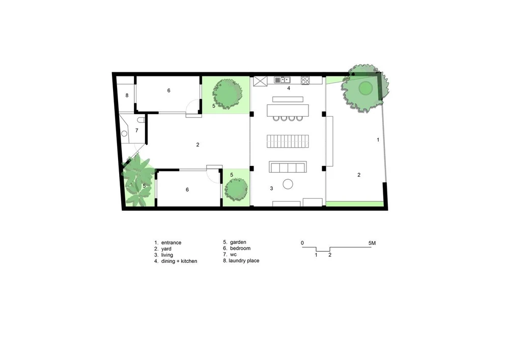 Bếp và bàn ăn bên cạnh khoảng thông tầng có trồng cây xanh khiến không gian này nhận được lượng ánh sáng vừa phải. |