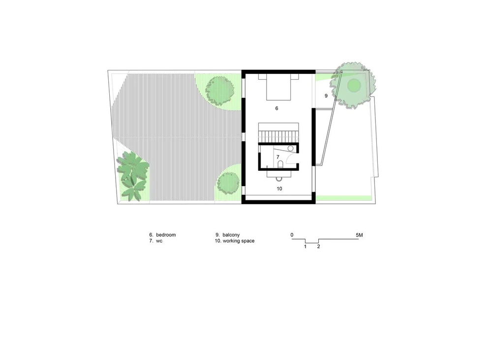 Bằng việc sử dụng màu trắng và ghi bao trùm các không gian, ngôi nhà như được mở rộng khi kết hợp với cây xanh. |