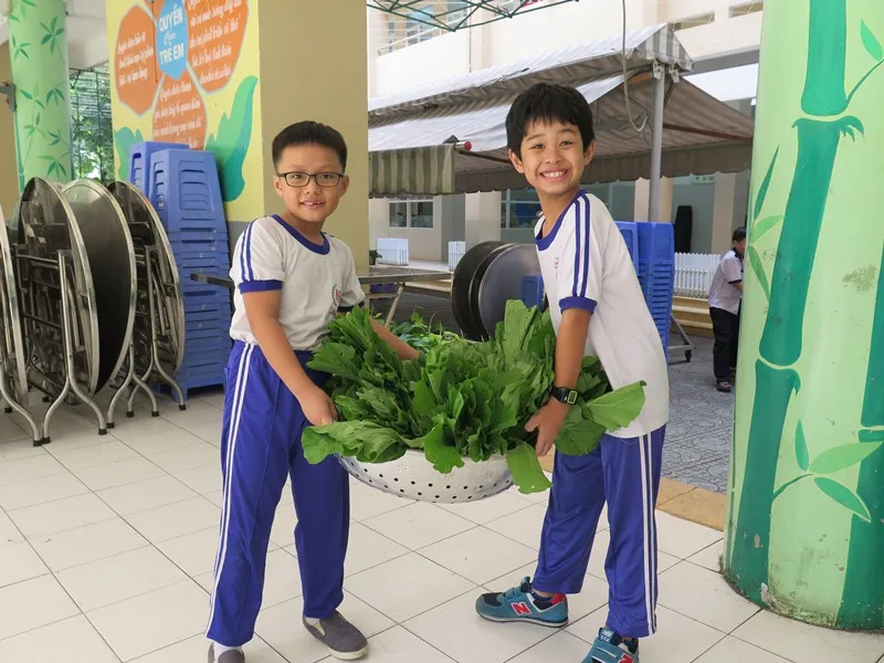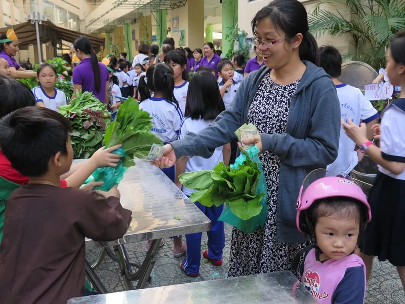 Vườn rau này được trường thực hiện gần một năm nay, mỗi học kỳ sẽ có 2-3 đợt thu hoạch để tổ chức thành hội chợ để phụ huynh hoặc khách tham quan có thể mua về ăn với giá 20.000 đồng/bó. Số tiền thu được sẽ thành quỹ của từng lớp để các em chi tiêu trong các hoạt động của lớp.