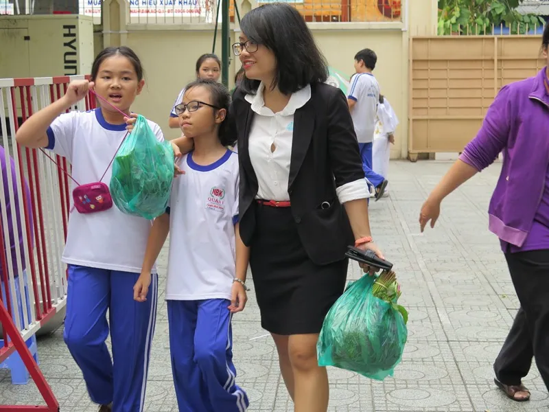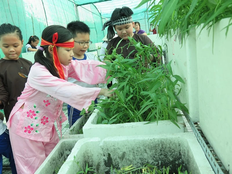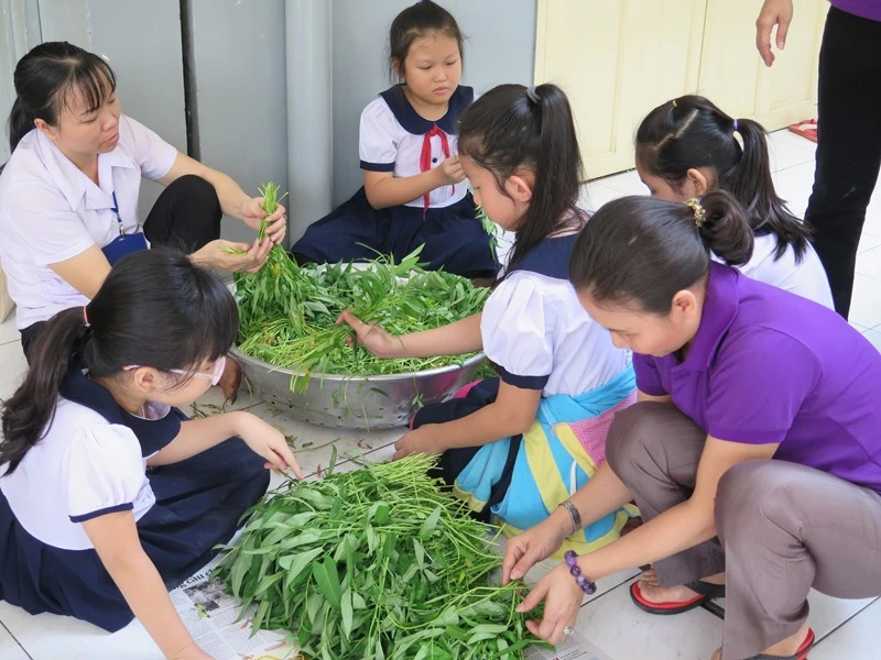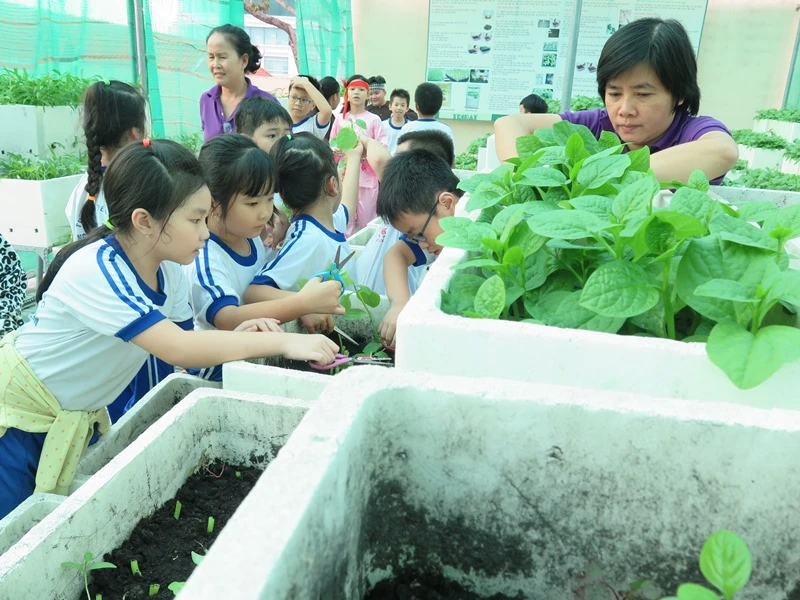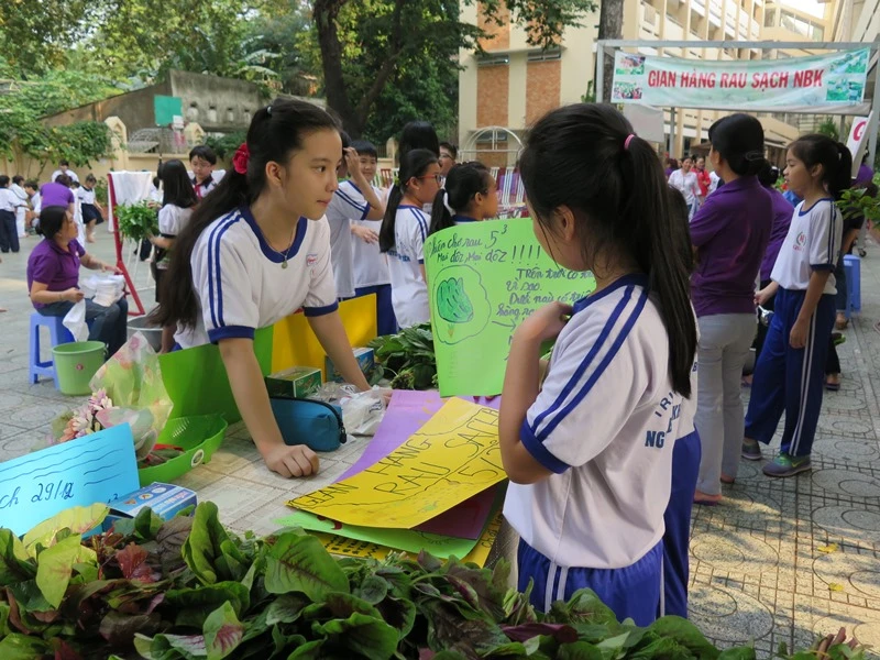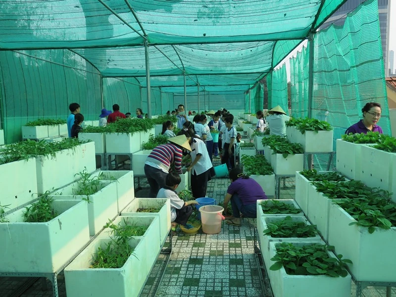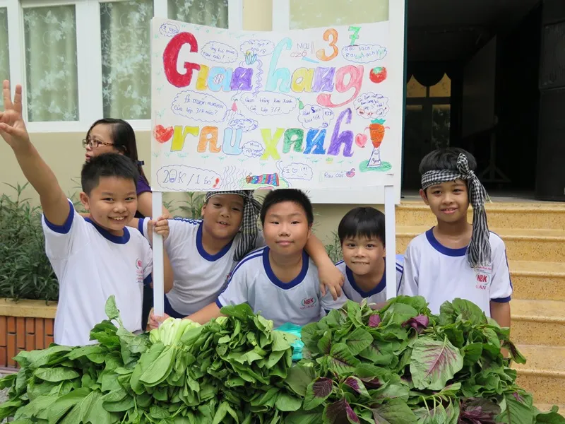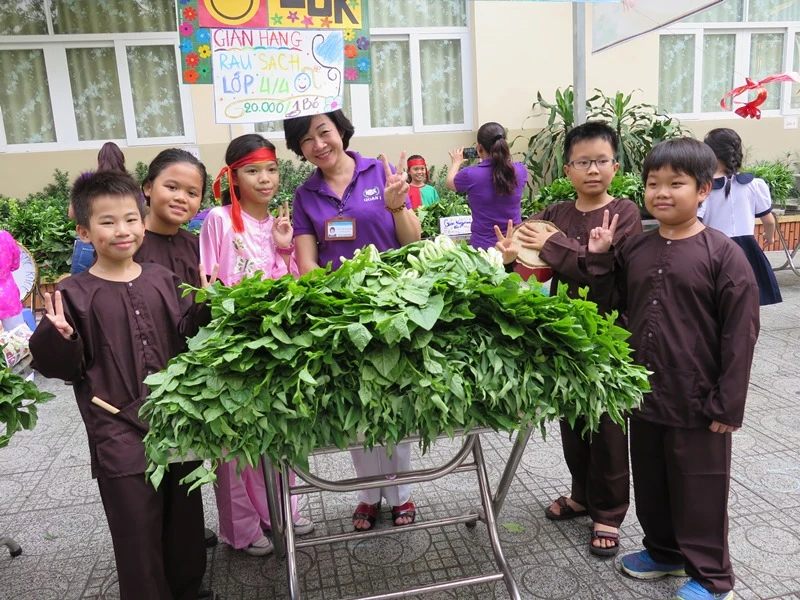 Bà Lâm Hồng Lãm Thúy, hiệu trưởng nhà trường, cho hay các rau sạch này được HS trồng suốt gần hai tháng qua trên khuôn viên sân thượng ở tầng 4 với diện tích hơn 400 m2. Các luống rau được các em cùng với sự hướng dẫn của các cô bảo mẫu chăm trồng trong những thùng xốp. Mỗi lớp một gian, mỗi lớp nhỏ được tám thùng xếp, lớp lớn được 18 thùng/lớp. Mỗi lớp sẽ tự chọn loại rau để trồng, các cô bảo mẫu sẽ làm đất rồi HS gieo trồng, tưới mỗi ngày, thu hoạch, tự bó rau và bày bán.