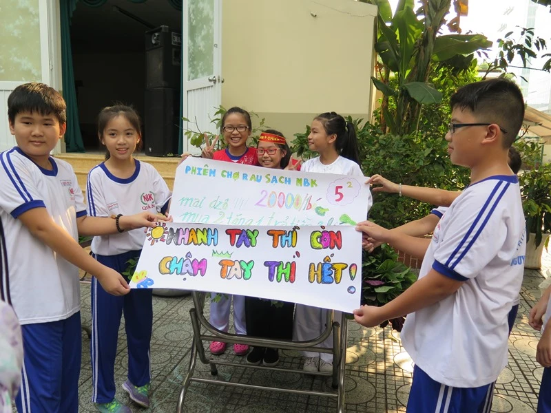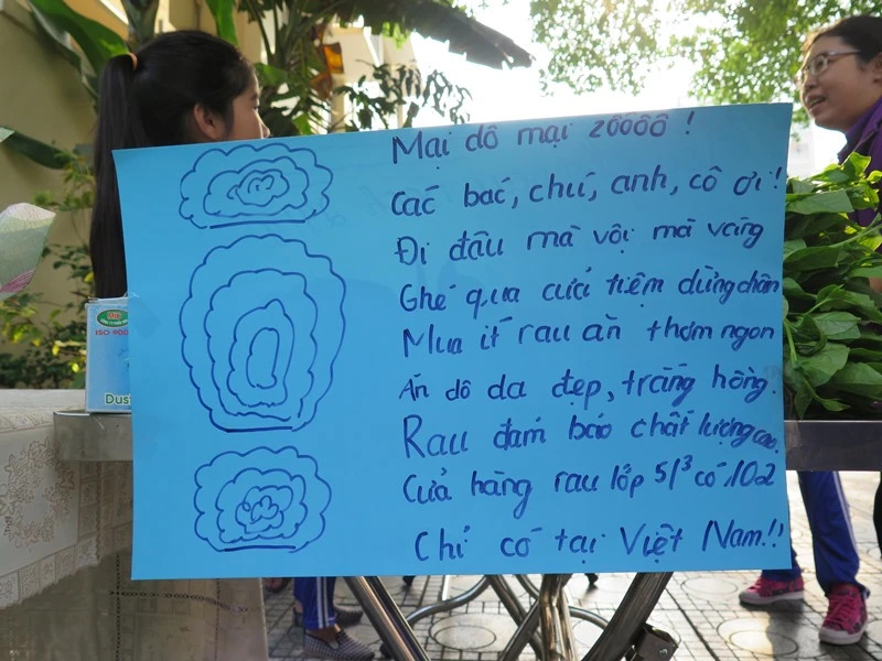 Trong đó, 39 gian hàng của 39 lớp, còn lại là của nhóm chi đoàn nhà trường. Các rau được trồng và bày bán chủ yếu là rau muống, mồng tơi, rau dền, cải, cải mầm... Để thu hút “khách hàng” là các phụ huynh, các em tự tay trang trí gian hàng của mình, “mời gọi” bằng nhiều hình thức để rau được bán chạy nhất.