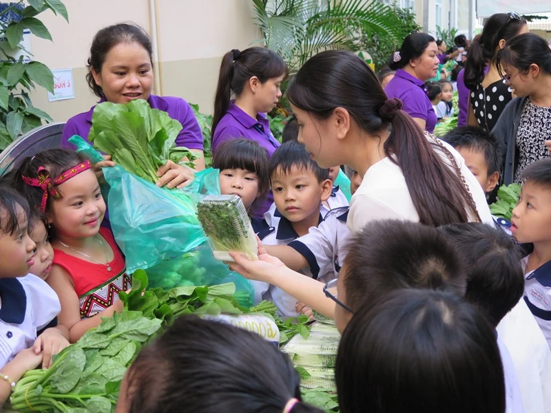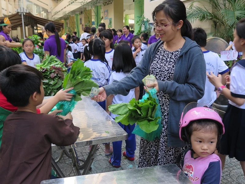 Để có được hội chợ này, ngay từ 2 giờ chiều, các lớp đã tiến hành thu hoạch, nhặt và bó rau, trang trí gian hàng sao cho bắt mắt để bắt đầu bán lúc 4 giờ, khi phụ huynh đến đón con.