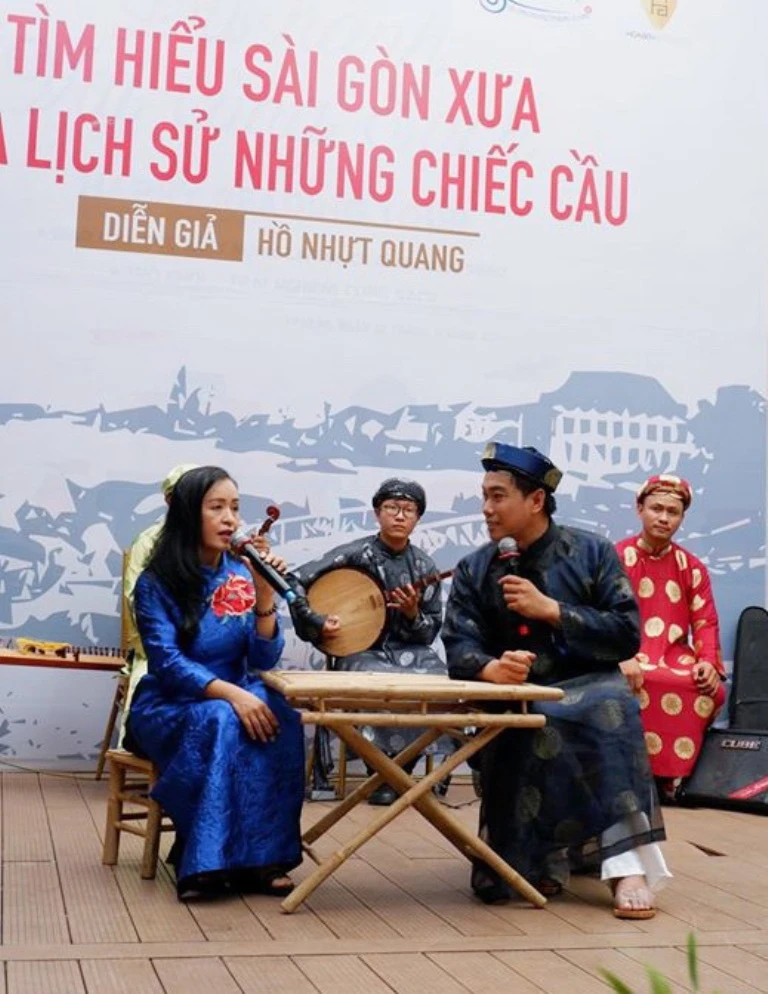 Diễn giả Hồ Nhựt Quang và nghệ sĩ đàn tranh Hải Phượng chia sẻ về lịch sử và vẻ đẹp của những chiếc cầu tại TP.HCM.