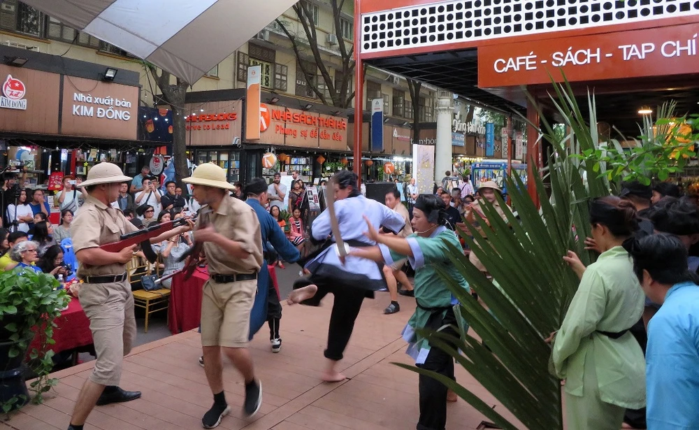 Hơn 200 khán giả của đường sách bị thu hút bởi tác phẩm có sự tham gia của các bạn sinh viên Trường ĐH Hoa Sen, thể hiện vũ đạo đấu võ chống trả lại quân Pháp như một nghệ sĩ chuyên nghiệp.