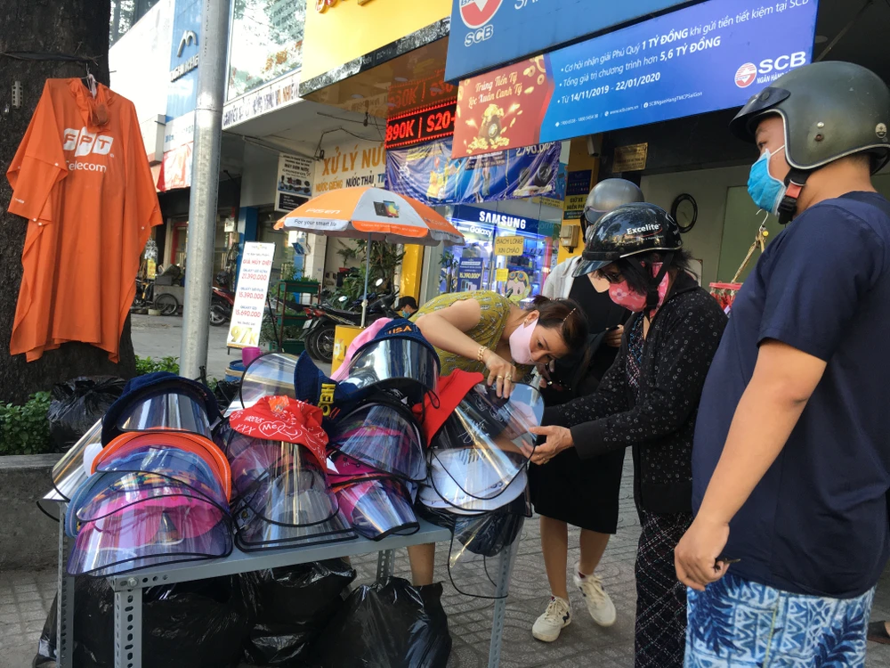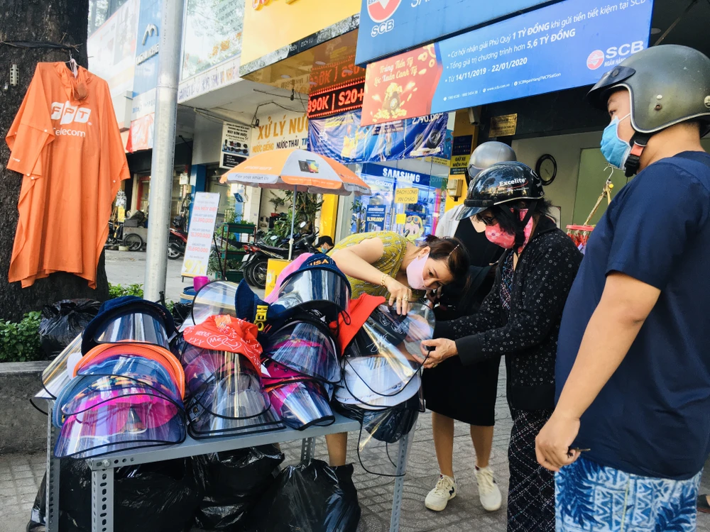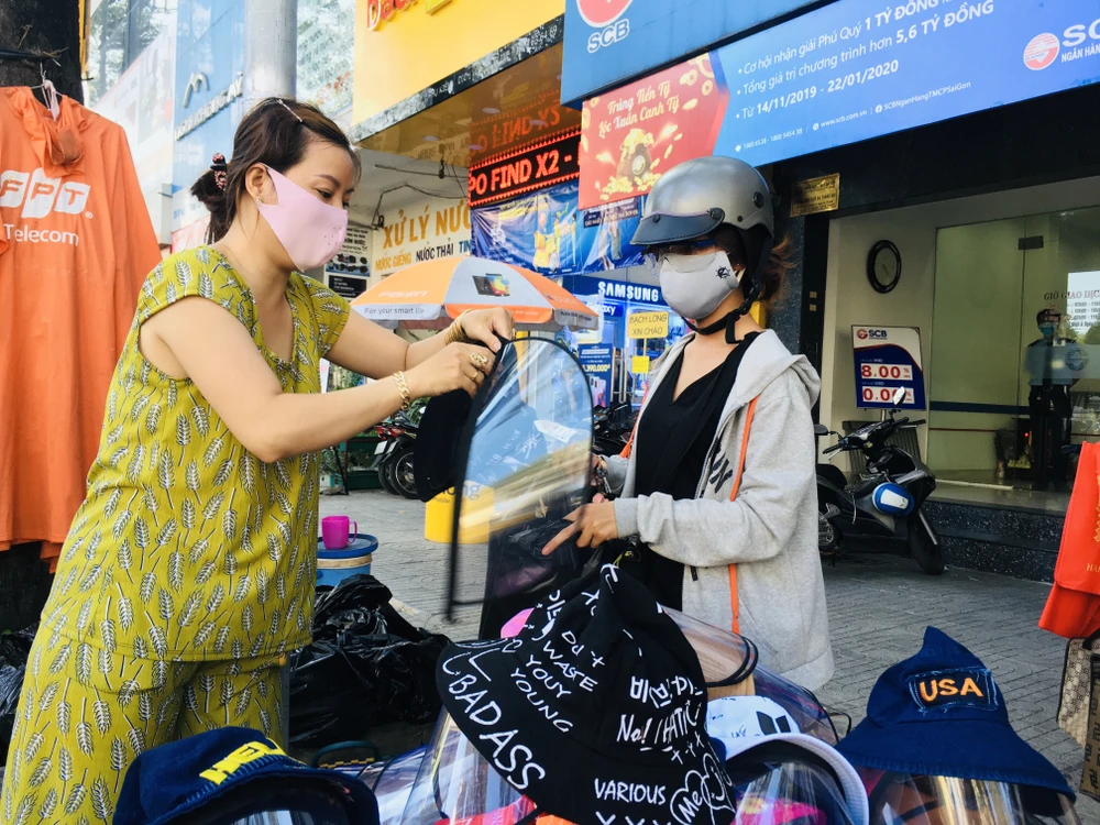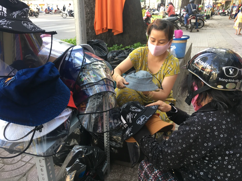 Tỉ mẩn lựa hai chiếc mũ cho hai đứa con nhỏ, chị Hoa (quận Bình Thạnh) cho biết nghe người quen mách ở đường 3-2 (quận 10) có bán loại mũ này, ngay khi tan làm chị chạy xe vội lên để mua cho con. "Dịch còn diễn biến phức tạp, mình phải tự bảo vệ mình và người thân thôi. Nón này cũng tiện, con đeo khẩu trang với đội nón vào là kín mít, nói chuyện với người khác cũng không ngại bị bắn gọi nước vào, không có ai thì mình tháo ra cho thoáng. Dùng xong thì để gọn vào cốp xe được. Hết mùa dịch thì mình có thể tháo rời phần chắn phía trước ra, cho con đội như mũ đội nắng thông thường", chị nói.