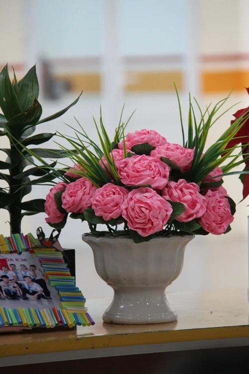 Những tờ giấy đã qua sử dụng được các bàn tay khéo léo tạo thành những cánh hoa sặc sỡ.