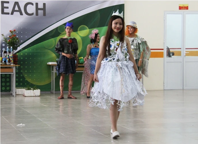 Ngoài trưng bày các sản phẩm tái chế, các bạn học viên còn tổ chức trình diễn thời trang từ các bộ trang phục cũng được làm nên bởi những đồ đã bỏ đi.