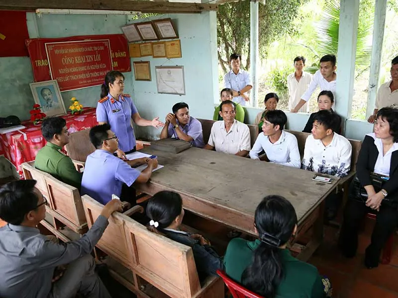 Hơn 20 phút sau, tại trụ sở sinh hoạt ấp, người người tề tựu chờ xem diễn biến. Đại diện VKS huyện cũng di chuyển đến nơi xin lỗi bằng vỏ lãi.