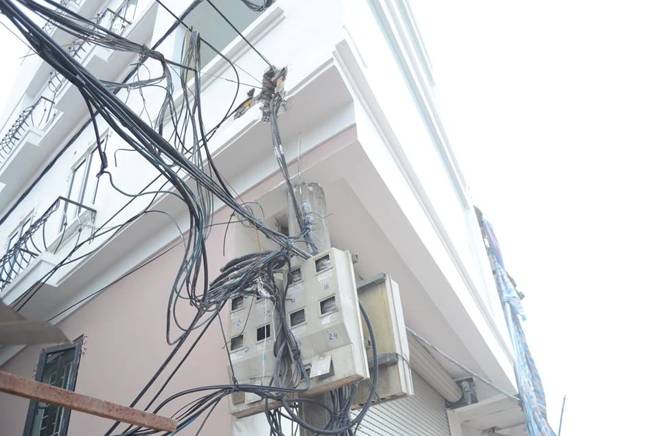 "Quá trình xây dựng tầng 1, đơn vị thi công đường Trần Khát Chân kéo dài đã trồng tạm cây cột điện trước cửa nhà để cấp điện cho các hộ dân trong ngõ. Sau đó khi xây dựng các tầng tiếp theo, đường chưa làm xong nên cột mới bị xây vào bên trong" - bà Thơm cho hay.