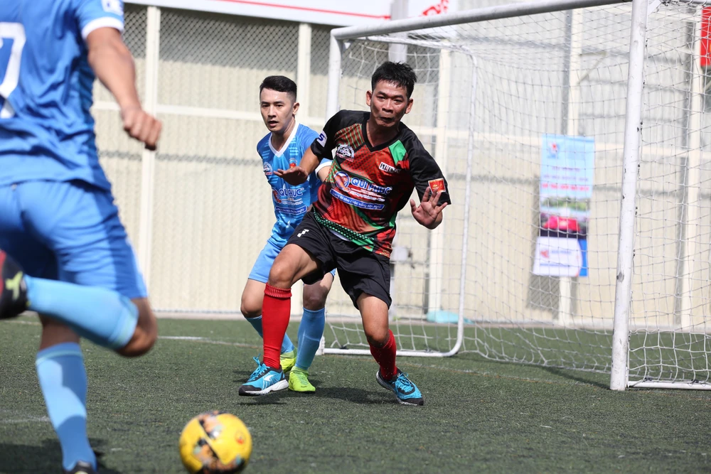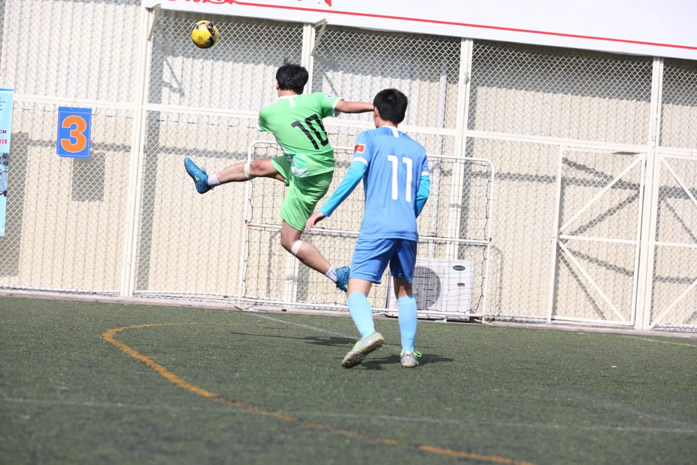 Kiên Cường (10) phá bóng giải vây cho đội báo Pháp luật TP.HCM.