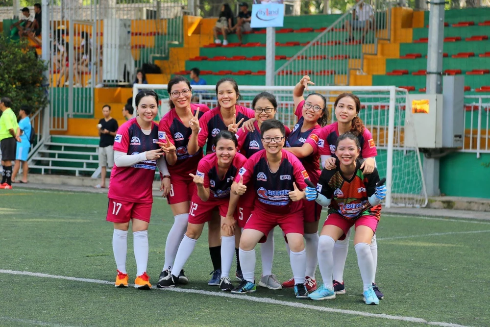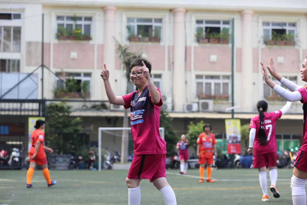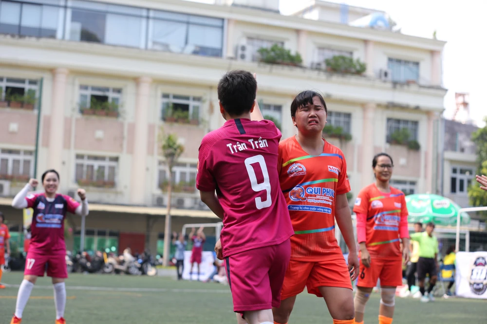 Các cầu thủ nữ báo Pháp luật TP.HCM vui mừng sau bàn thắng đầu tiên tại giải.