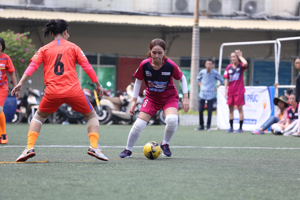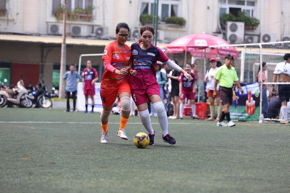 Số 6 của đội nữ báo Pháp Luật TP.HCM là Huyền Vân (áo hồng) trong một pha tranh bóng.