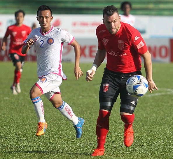 Simic (phải) không còn cơ hội ra sân trong màu áo Long An để nhường chỗ cho nội binh chuẩn bị trận play off