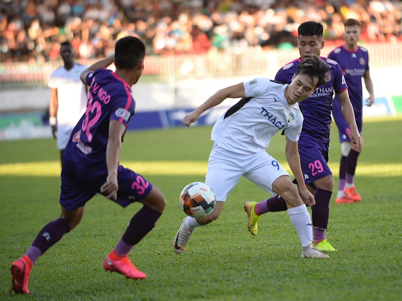 Văn Toàn vùng vẫy trong vòng vây của cầu thủ Sài Gòn. Ảnh: HÀ NGỌC