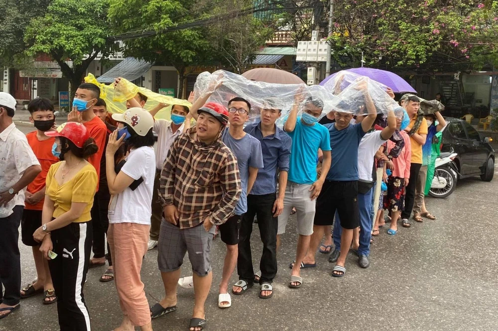 Người hâm mộ bóng đá Thanh Hóa đội mưa từ sớm chờ mua vé xem đội nhà tiếp khách HA Gia Lai chiều 28-4. Ảnh: ANH THẮNG.