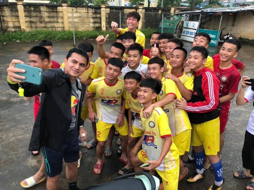HLV Kiatisak thân thiện selfie cùng các cầu thủ nhí Thanh Hóa. Ảnh: ANH THẮNG.