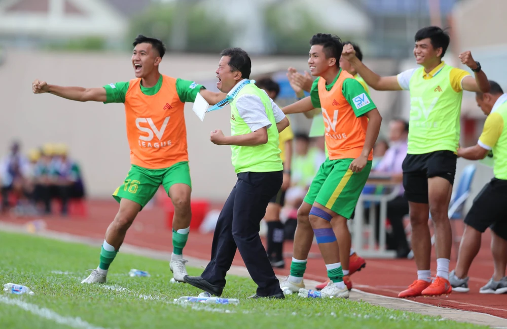 Cảm giác hạnh phúc tột cùng của thầy trò Phan Hoàng Vũ khi cầu thủ Quốc Thắng ghi bàn thắng quý hơn vàng. Ảnh: ANH THÔNG.