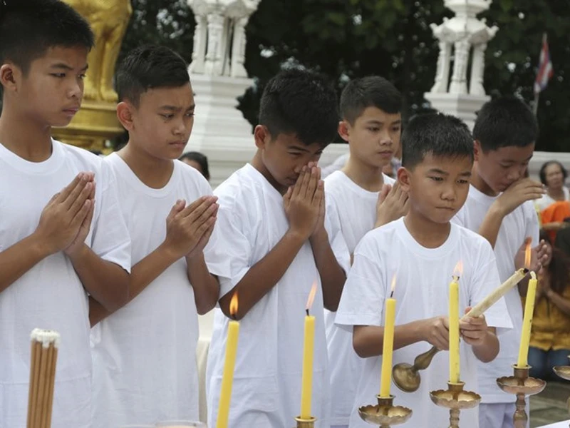 Trong ngày 24-7, chùa Wat Phra That Doi Tung tiến hành nghi lễ cúng bái và xuống tóc cho 11 cầu thủ cùng huấn luyện viên. Đây là ngôi chùa nằm gần hang Tham Luang Nang Non, nơi đội bóng bị kẹt suốt 18 ngày kể từ ngày 23-6 do nước lũ bịt kín lối ra vào.