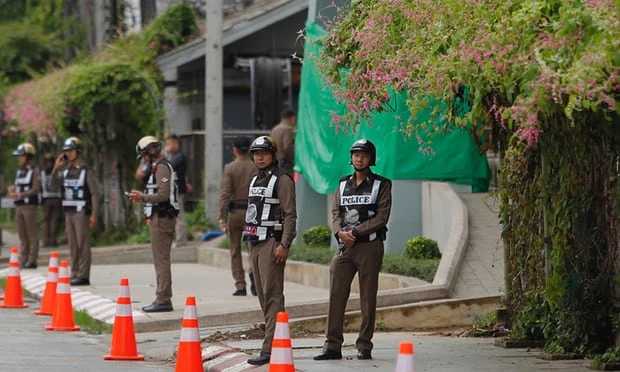 Cảnh sát Thái Lan đứng bên ngoài bệnh viện tỉnh Chiang RaiPrachanukroh. Ảnh: EPA