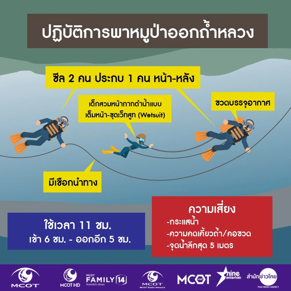 Chính phủ Thái Lan cũng công bố đồ họa về cách tiến hành chiến dịch giải cứu. Hai thợ lặn sẽ đi cùng mỗi bé trai, đeo đầy đủ mặt nạ dưỡng khí và được dây thừng dẫn đường. Trong những lối hẹp, thợ lặn sẽ thả bình khỏi lưng và từ từ lăn nó, dẫn đường cho bé trai qua. Từ khu vực số ba của hệ thống hang, họ sẽ đi bộ tới cửa hang.