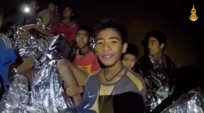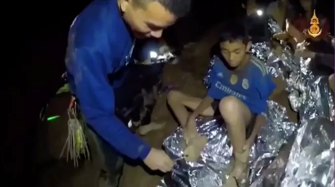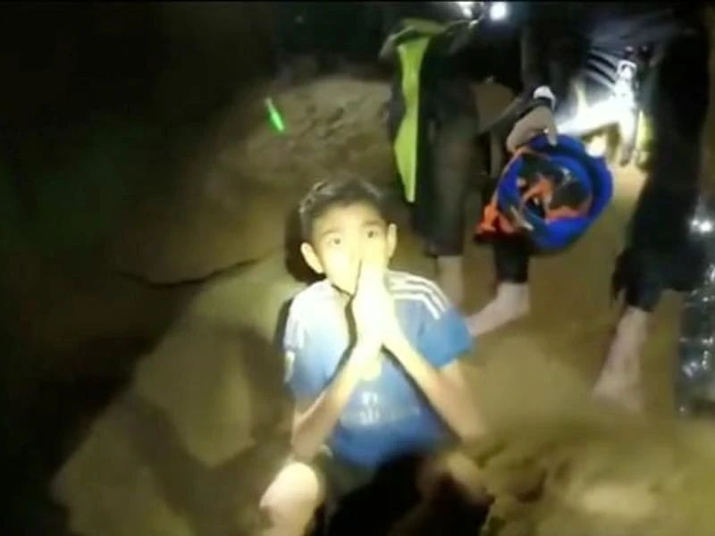 Một đoạn video do đặc nhiệm SEAL công bố sáng 4-7 cho thấy hai thành viên của đội cứu hộ ngồi trên một mô đất cao trong hang, bên cạnh các cậu bé được trùm chăn bạc cứu hộ. Người xem có thể thấy tinh thần lạc quan khi nghe tiếng cười của các cậu bé.