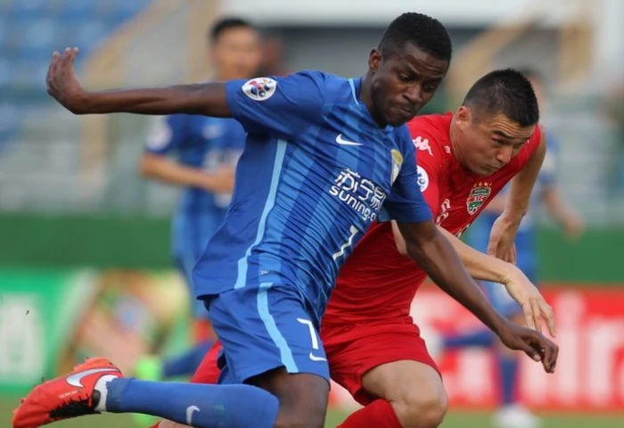 Hậu vệ Đặng Văn Robert (áo đỏ, B. Bình Dương) kèm chặt cựu sao Chelsea- Ramires của Jiangsu FC