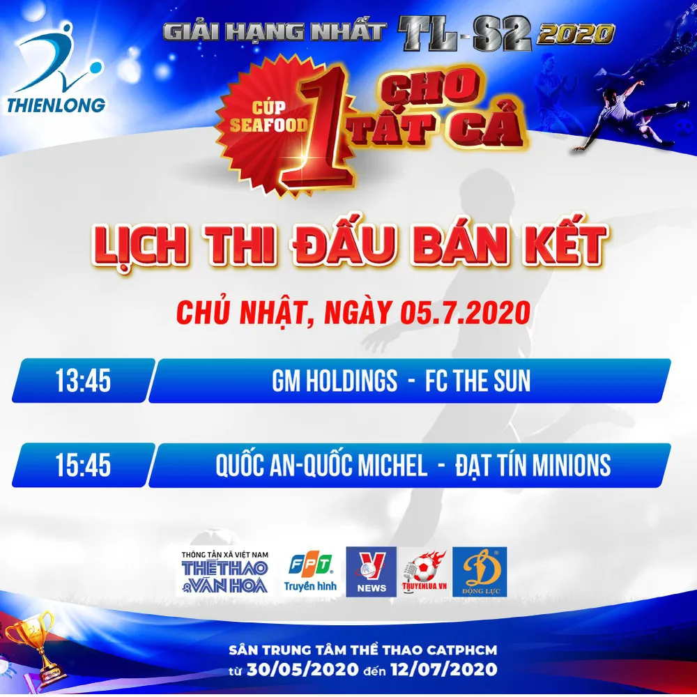 Hai trận bán kết chiều 5-7 trên sân Trung tâm thể thao Công an TP.HCM GM Holdings- FC The Sun (lúc 13 giờ 45) và Quốc An- Quốc Michel- Đạt Tín Minions (15 giờ 45) hứa hẹn những cuộc chạm trán nảy lửa.