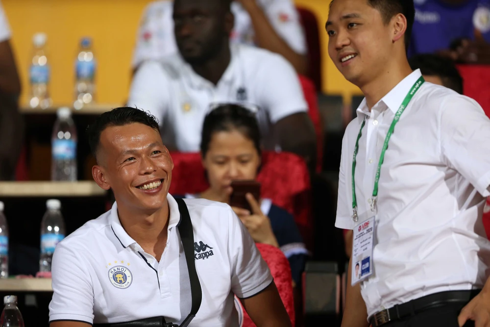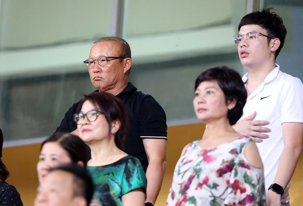 Trên khán đài HLV Park Hang-seo dự khán trận đấu, ngoài ra tân binh thủ môn Bùi Tấn Trường của Hà Nội cũng ngồi quan sát đồng đội thi đấu.