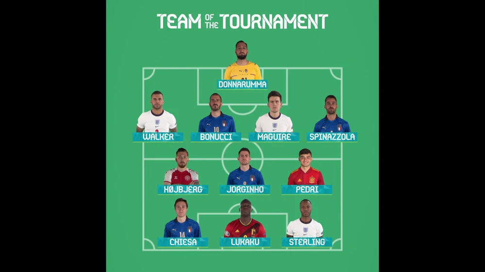 Bộ khung 5 cầu thủ Ý trải đều ở các vị trí gồm cầu thủ xuất sắc nhất giải, thủ môn Gianluigi Donnarumma, trung vệ Leonardo Bonucci, hậu vệ biên Leonardo Spinazzola, người bị đứt gân Acchile trong trận tứ kết với Bỉ, tiền vệ trung tâm Jorginho, tiền đạo lệch phải Federico Chiesa.