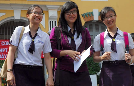 Thí sinh tươi cười nhẹ nhõm sau khi kết thúc kỳ thi tốt nghiệp THPT tại TP.HCM. Ảnh: HTD