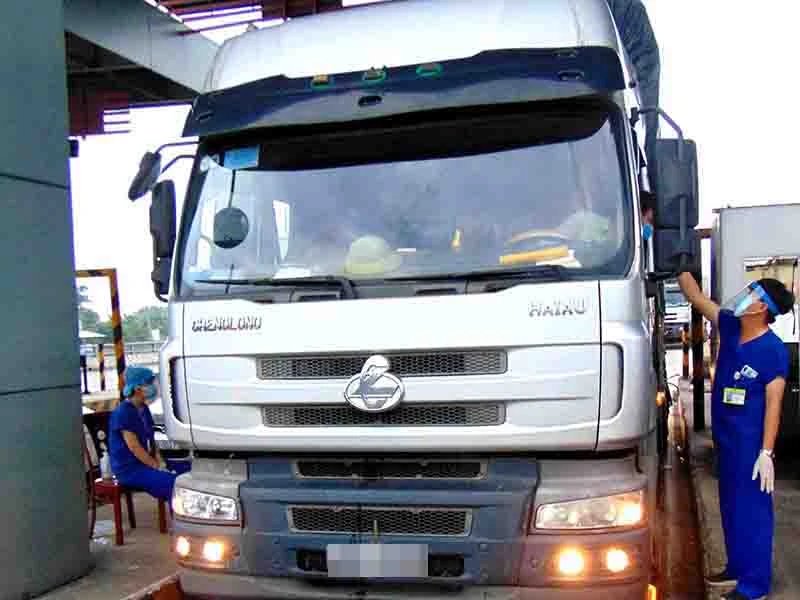 Do xe tải và xe container cao nên nhân viên y tế phải rướn mình để đo thân nhiệt tài xế. Ảnh: TRẦN NGỌC