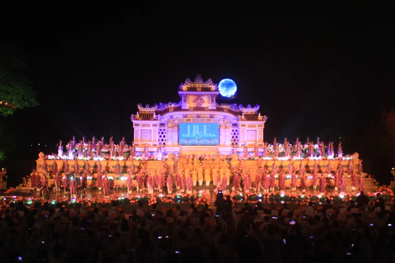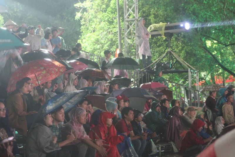 Ngay trong đêm khai mạc, tại TP Huế trời đổ mưa, đại biểu, người dân và du khách đến xem chương trình điều vui vẻ đội mưa ngồi xem hết các tiết mục đặc sắc được nhiều đơn vị nghệ thuật trong cả nước biểu diễn.